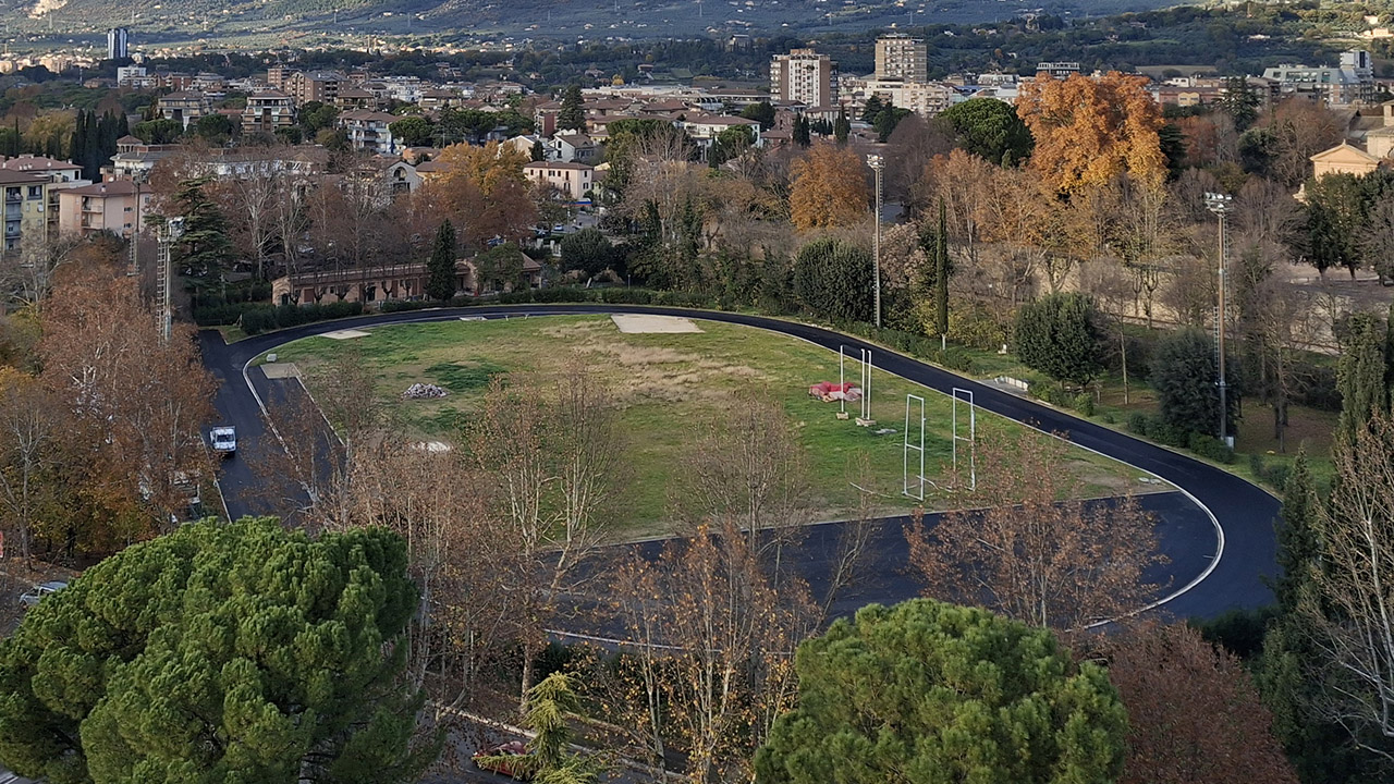L’intervento riguarda il rifacimento del manto superficiale della pista di atletica leggera, la ristrutturazione e riqualificazione degli spogliatoi e l’adeguamento sismico della tribuna spettatori. Congiuntamente agli interventi previsti per il confinante parco de “la Passeggiata” rappresenta una vera occasione di rigenerazione urbana di una significativa area a immediato ridosso del centro storico ove sono stati già posti in essere interventi di riqualificazione con realizzazione di una pista ciclo – pedonale molto utilizzata.