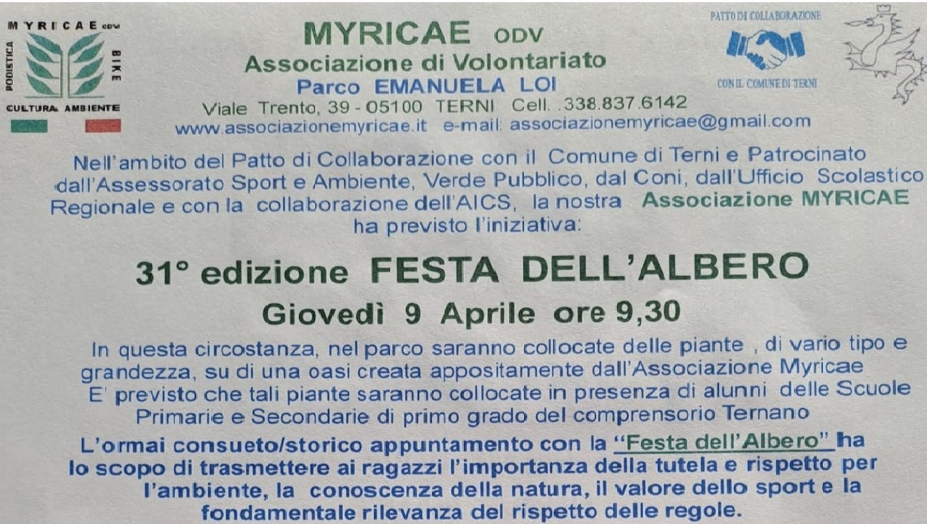 Il giorno 09 aprile 2026 alle ore 09:30, nel Parco Emanuela Loi di Viale Trento si svolgerà la trentunesima edizione della manifestazione denominata "Festa dell'albero" nel corso della quale saranno collocate in una oasi creata appositamente dalla Associazione Myricae piante di vario tipo e misura alla presenza di alunni delle scuole primarie e secondarie di primo e secondo grado del comprensorio ternano.