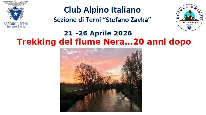 Mercoledì 22 aprile 2026 nella sala consiliare di Palazzo Spada alle ore 11.30 si svolgerà la conferenza stampa di presentazione della manifestazione "Trekking del Nera....venti anni dopo" organizzata dal CAI- Club Alpino Italiano Sezione di Terni Stefano Zavka.