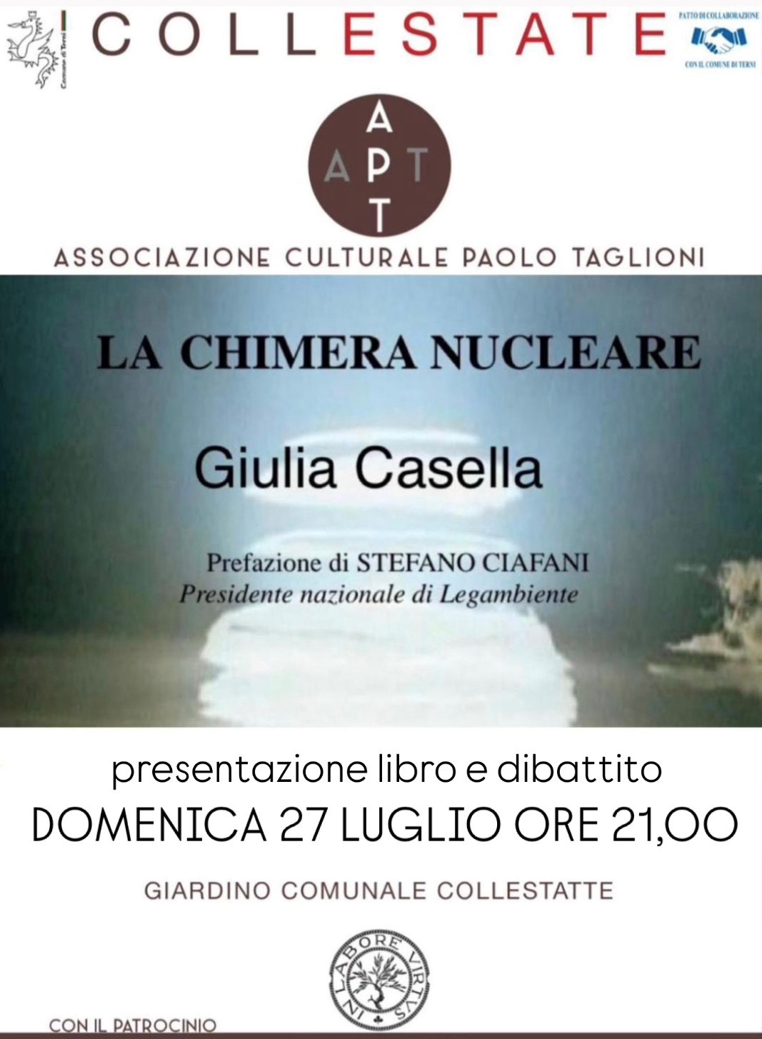Domenica 27 luglio dalle ore 21 nel giardino Comunale di Collestatte, nell’ambito del Patto di collaborazione tra il Comune di Terni e l’Associazione Culturale Paolo Taglioni, si svolgeranno la presentazione ed il dibattito sul libro "La chimera nucleare" di Giulia Casella.