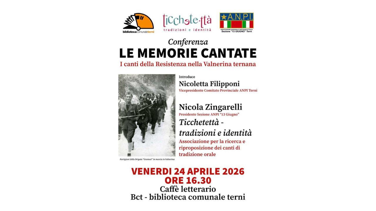 Le memorie cantate - I canti della Resistenza nella Valnerina ternana, a cura della sezione ANPI "13 Giugno" e dell'associazione "Ticchetettà - tradizioni e identità", che da diversi anni è attiva nella ricerca e nella riproposizione dei canti di tradizione orale. Introduce Nicoletta Filipponi, vicepresidente Comitato Provinciale ANPI Terni, relatori Nicola Zingarelli, presidente Sezione ANPI "13 giugno" e l'associazione "Ticchetettà - tradizioni e identità".