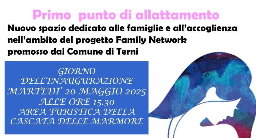 Martedì 20 maggio 2025 alle ore 15,30 nell'area turistica della Cascata delle Marmore è stata programmata l’inaugurazione del primo punto di allattamento, che rientra nell’ambito del progetto Family Network, promosso dal Comune di Terni per mettere a disposizione spazi dedicati alla famiglia ed all'accoglienza.