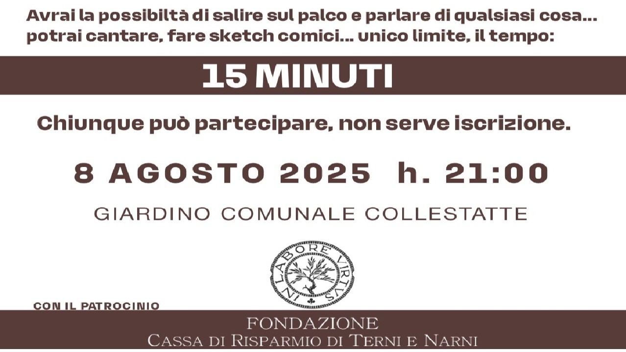 Venerdì 8 agosto 2025 alle ore 21 nell’ambito del Patto di Collaborazione tra l’Associazione Culturale Paolo Taglioni ed il Comune di Terni che hanno co-progettato l’iniziativa, si svolgerà l'evento "15 minuti", nel Giardino Comunale di Collestatte, nell'ambito del quale sarà permesso a tutti di salire sul palco per esprimersi, parlando, cantando o recitando, senza superare il limite di tempo massimo dei 15 minuti.