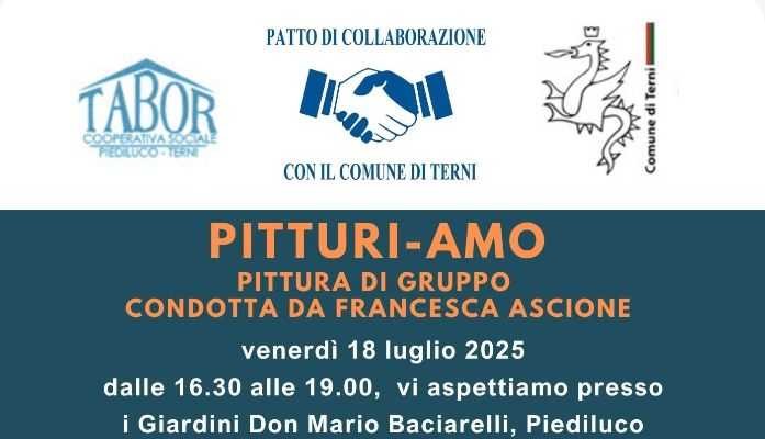 Nell’ambito del patto di collaborazione del Comune di Terni con la Cooperativa Sociale Tabor si terrà venerdì18 luglio a Piediluco nel giardino “Don Mario Baciarelli” a partire dalle ore 16.30 l'evento gratuito e aperto a tutti "Pitturi - amo" una sessione di pittura di gruppo condotta da Francesca Ascione.