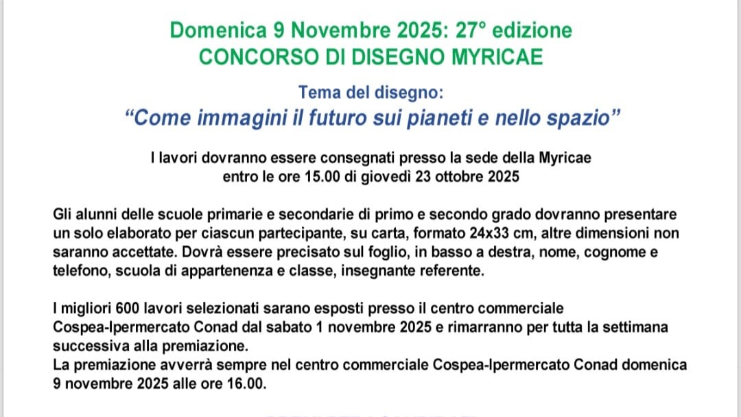 Domenica 9 Novembre 2025 alle ore 16 al Centro commerciale Cospea - Ipermercato Conad si svolgerà la premiazione del concorso di disegno "Come immagini il futuro sui pianeti e nello spazio" riservato agli alunni delle scuole primarie e secondarie di primo e secondo grado.