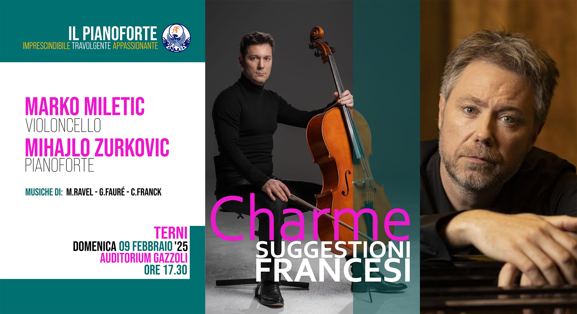 Tutto il fascino della musica francese eseguita dedicata dal duo Miletic, Zurkovic violoncello e pianoforte: dalla Sonata in Re min di Debussy dall’aura notturna, lunare, quasi magica, alla sonata capolavoro del belga, ma francese d’adozione, Cesar Franck, originariamente scritta per violino e pianoforte, definita un “lavoro cartesiano” per la limpidezza e lo straordinario equilibrio nel dialogo fra i due strumenti. Il fascino di brani come “Habanera” e” Kaddisch” di Ravel o la Romanza di Faurè completeranno questo programma suggestivo affidato al talento e al carisma dei due interpreti serbi, artisti di primissimo piano nella scena musicale dell’est europeo.