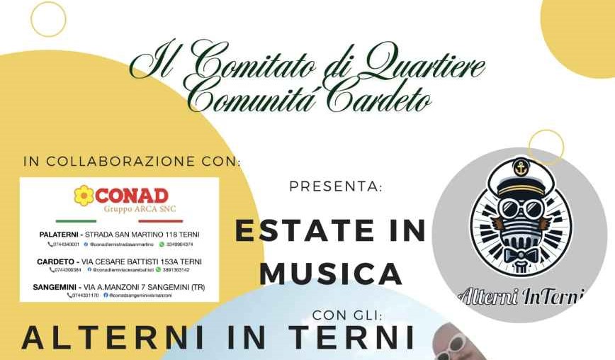 Nell’ambito del Patto di Collaborazione tra la “Comunità Cardeto” ed il Comune di Terni il giorno giovedì 11 settembre 2025 nel Parco Cardeto dalle ore 21:30 presso la piazzetta adiacente la casetta del Comitato si terrà il concerto del gruppo musicale "Alterni Interni".