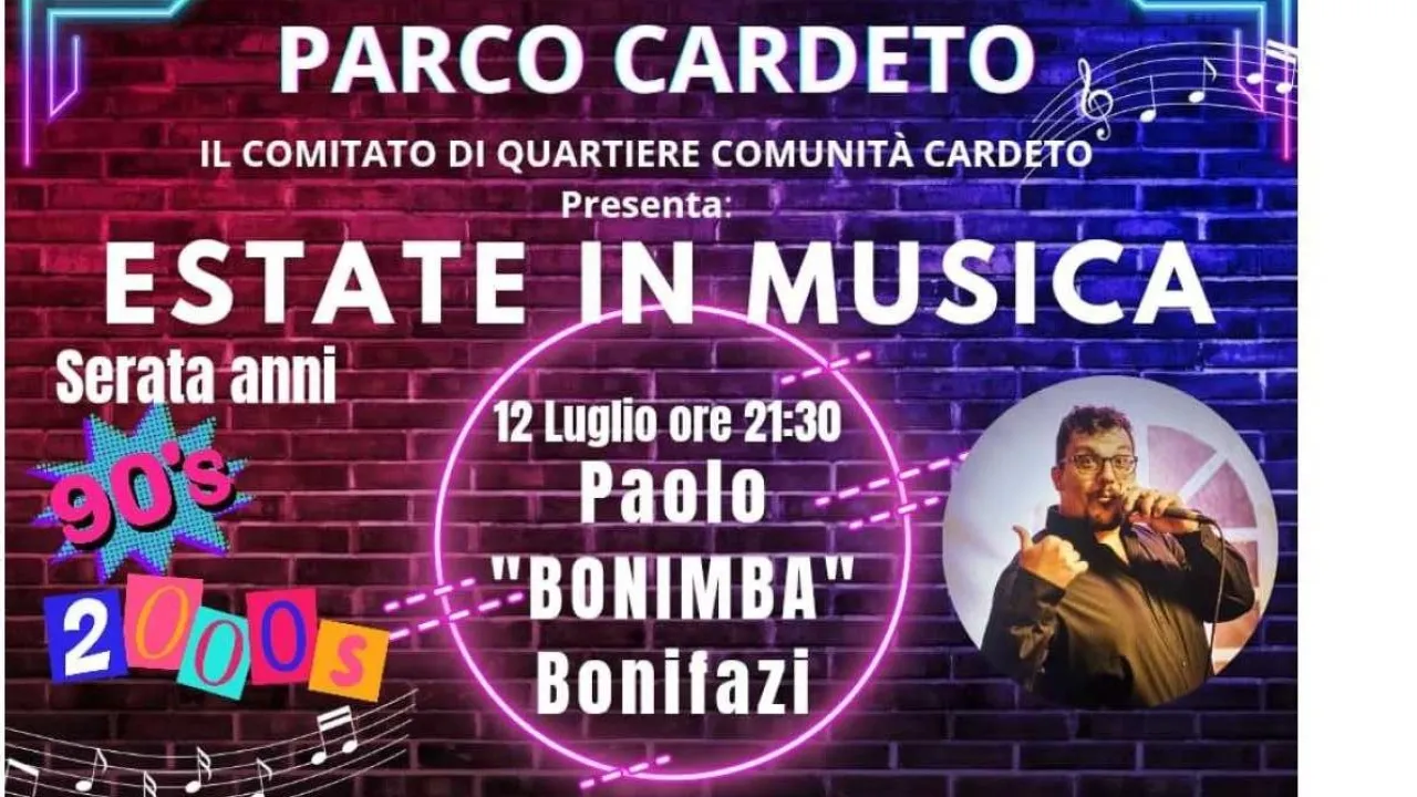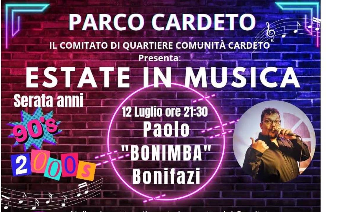 Nell’ambito del patto di collaborazione “Comunità Cardeto”, sabato 12 luglio a partire dalle ore 21,30 si svolgerà nell'ambito di "Estate in musica" la serata musicale con Paolo "Bonimba" Bonifazi dedicata ai brani di successo degli anni novanta e duemila.
