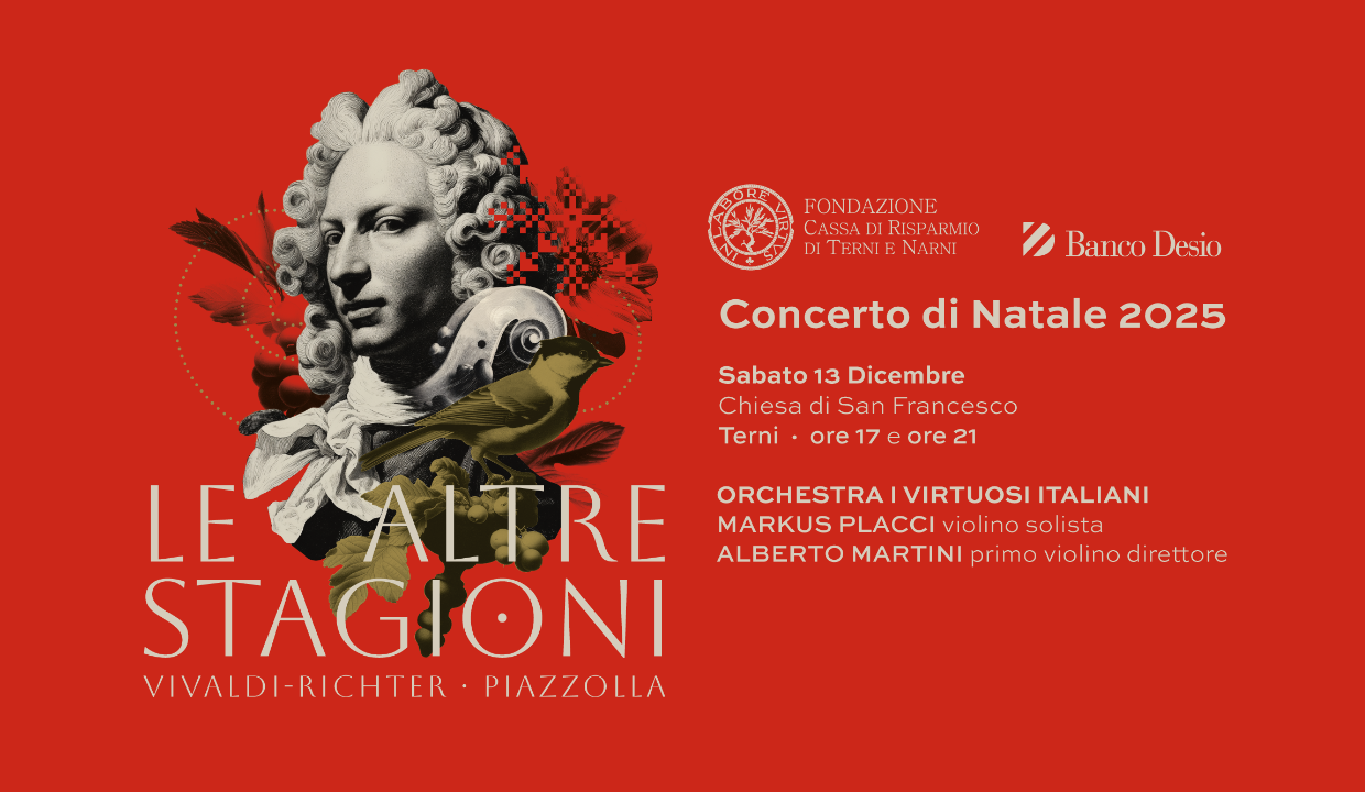 Nel cuore del periodo natalizio, si rinnova il sodalizio tra la Fondazione Carit e Visioninmusica che, con il sostegno di Banco Desio e della Brianza, regalano alla città di Terni un evento concertistico di grande suggestione spirituale e artistica: sabato 13 dicembre, nella splendida cornice della Chiesa di San Francesco, il tradizionale Concerto di Natale si sdoppia in due appuntamenti – alle ore 17.00 e alle 21.00. Il programma, Le Altre Stagioni, propone un confronto dinamico tra linguaggi e tradizioni. Da una parte, la visione radicale di Max Richter, che frammenta e ricompone le Quattro Stagioni di Vivaldi in un'esperienza meditativa e contemporanea. Dall'altra, il calore malinconico del tango nuovo di Astor Piazzolla con Las Cuatro Estaciones Porteñas, nella celebre trascrizione per violino e archi di Leonid Desyatnikov. L'orchestra I Virtuosi Italiani e Markus Placci al violino solista assicurano un'interpretazione di altissimo pregio artistico e impeccabile precisione tecnica.