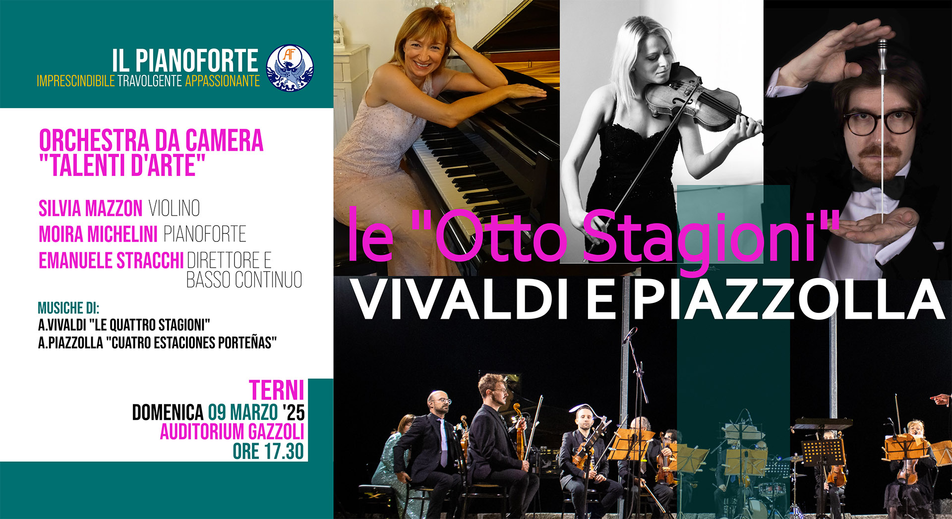 Dal barocco al tango, in questo concerto due mondi musicali si incontrano realizzando un ponte ideale di due secoli, un viaggio musicale che parte da Venezia e arriva alla Buenos Aires del novecento. Si inizia con l’ascolto delle Quattro Stagioni di Antonio Vivaldi nelle quali la descrizione dei ritmi della natura si fa spettacolo e melodia. L’interpretazione è affidata al violino di Silvia Mazzon artista dalla straordinaria sensibilità, formatasi alla scuola di Pavel Vernikov, membro dei Solisti Filarmonici Italiani. Concluderanno il concerto le Cuatro Estaciones Portenas di Astor Piazzolla con una rivisitazione dal carattere emotivo-psicologico e più soggettiva delle diverse stagioni dell’anno. La pianista Moira Michelini con le sue doti esecutive darà vita a questa introspezione dei paesaggi dell’animo umano. In questo concerto tradizione e modernità si incontrano grazie anche ai virtuosismi dell’ensemble i Talenti d’Arte e al M° Emanuele Stracchi al quale è affidato il sapiente arrangiamento dei brani e la direzione orchestrale.