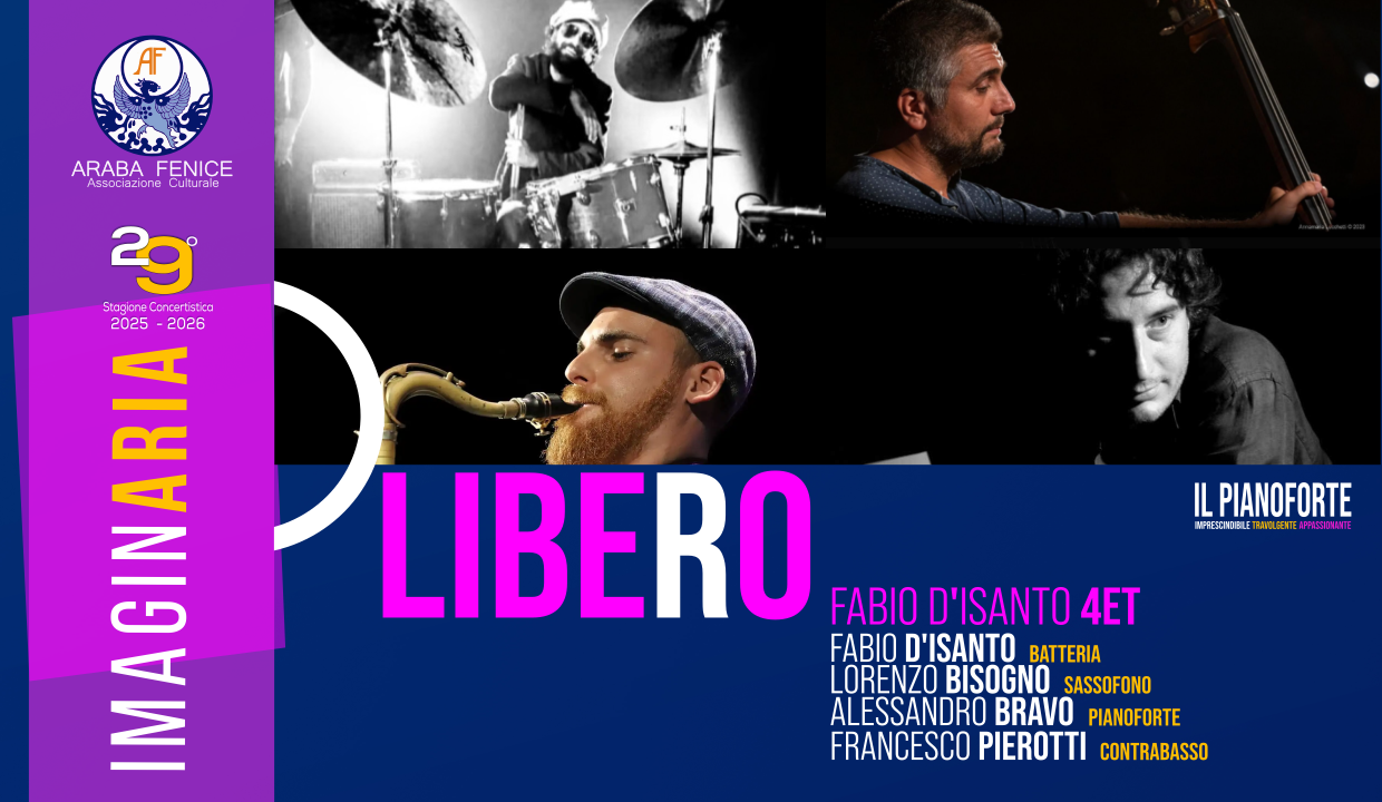 Un concerto originale e inconsueto, dedicato al Jazz nella sua forma più intrigante e godibile, con brani tratti dall’ultimo album del D’Isanto 4et, come Maia e Roots accanto a melodie immortali di Gershwin e Porter. Il Fabio d’Isanto Quartet, è composto da Fabio D’Isanto alla batteria, Lorenzo Bisogno al sassofono, Alessandro Bravo al pianoforte e Francesco Pierotti al contrabbasso, quattro musicisti d’eccezione, artisti straordinari, dalle personalità forti e profondi conoscitori della sintassi jazzistica. Una sinergia che agisce inter pares e che si muove agilmente attraverso le varie epoche del jazz. Due parole per descrivere questo concerto: trascinante ed entusiasmante!