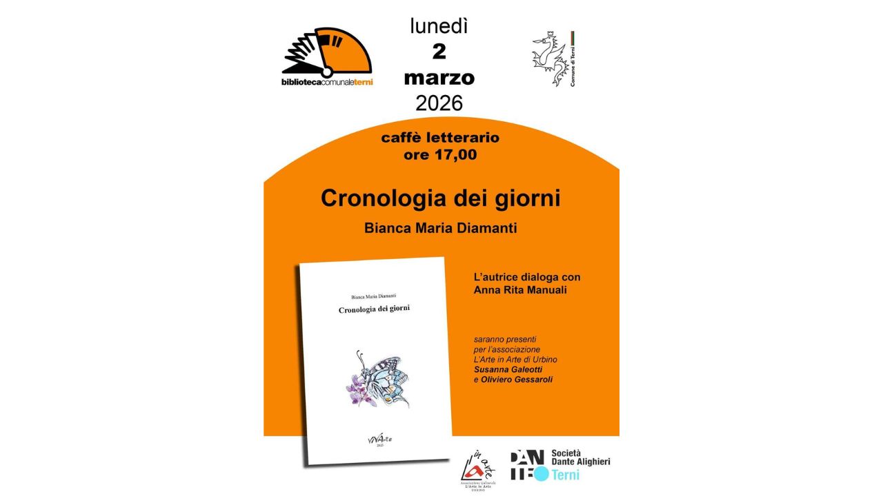 Incontro con Bianca Maria Diamanti autrice di Cronologia dei giorni (Vivarte), interviene Anna Rita Manuali – presidente Società Dante Alighieri comitato di Terni, Susanna Galeotti e Oliviero Gessaroli – ass. L’Arte in Arte di Urbino. L’artista Gisella Manuetti Bonelli espone tre opere nate in dialogo con le pagine del libro