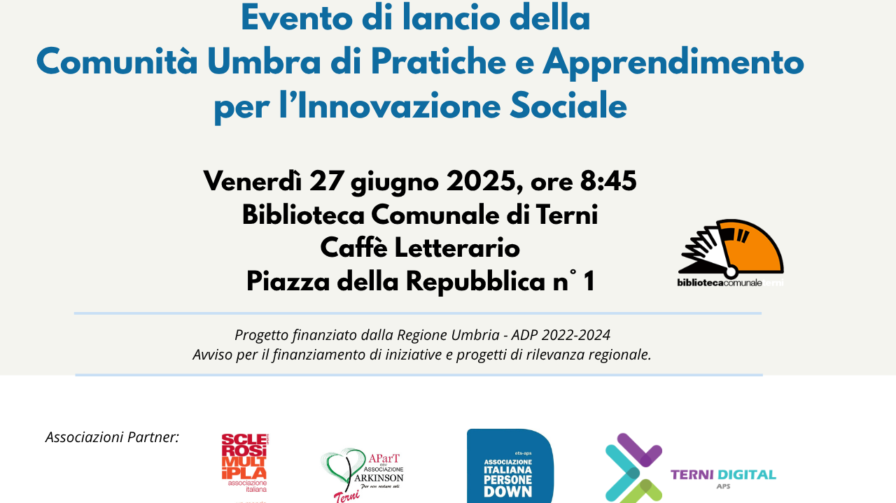 L'evento di lancio è in programma venerdì 27 giugno alle ore 8.45 nella biblioteca comunale BCT di Terni in Piazza della Repubblica, n°1, ed è promosso da AVI Umbria APS nell'ambito del progetto "Agency for Capacity Building, Protagonisti attivi per la Vita Indipendente e l'Inclusione", finanziato dalla Regione Umbria con avviso ADP 2022-2024.