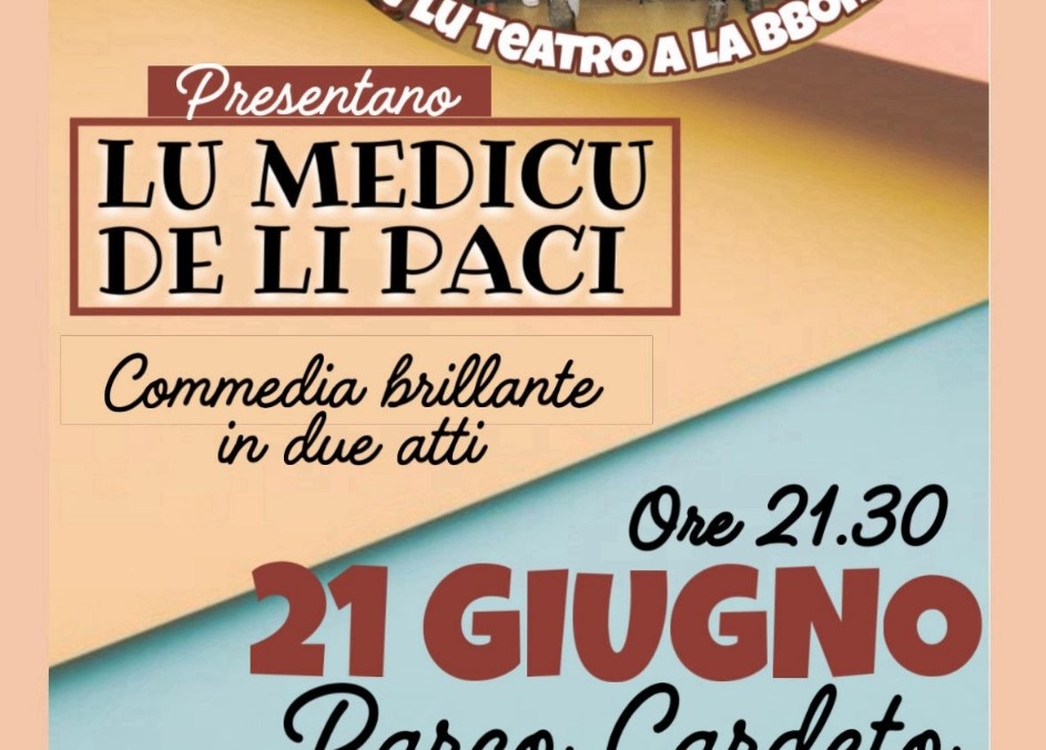 Nell’ambito del Patto di Collaborazione “Comunità Cardeto” il giorno sabato 21 giugno presso il Parco Cardeto si terrà lo spettacolo teatrale brillante in due atti "Lu medico de li paci" organizzato dal Comitato di quartiere Comunità Cardeto e interpretato dalla "Compagnia de lu teatro a la bona". Orario di inizio 21.30.