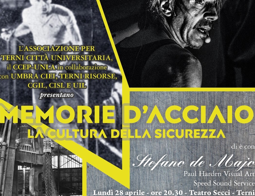 Lunedì 28 aprile in occasione della "Giornata internazionale della sicurezza sul lavoro" si svolgerà alle ore 20,30 al Teatro Secci di Terni lo spettacolo di e con Stefano De Majo"Memorie d'acciaio - la cultura della sicurezza".