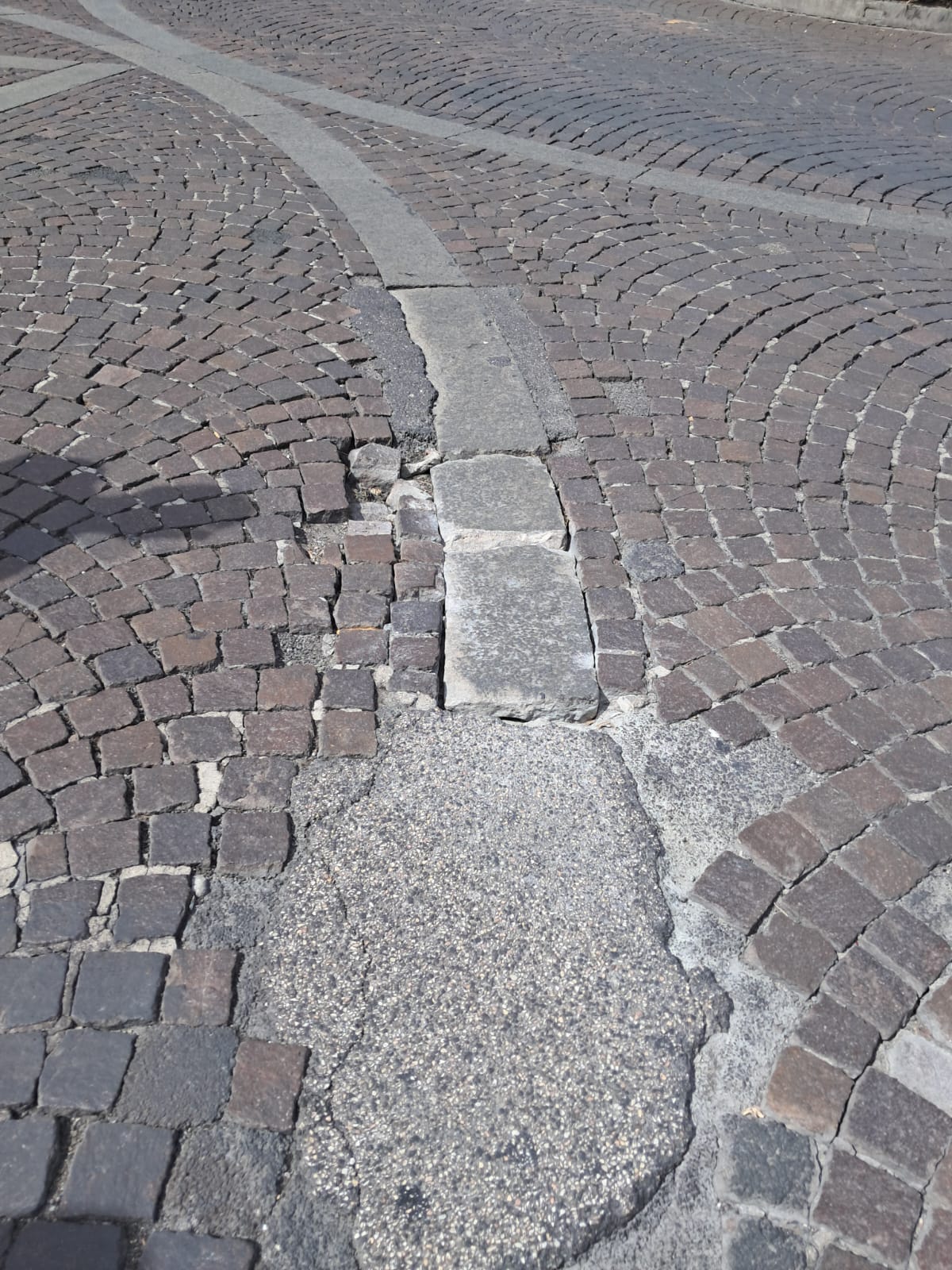 Le verifiche tecniche hanno rilevato gravi segni di degrado e danneggiamento del piano di calpestio in cubetti di porfido. Sono state riscontrate pesanti sconnessioni, avvallamenti, perdita di quota di calpestio, danneggiamenti alle lastre in granito, distacchi e mancanze di numerosi cubetti, deterioramento diffuso delle stuccature cementizie e ampie compromissioni della sottofondazione. Le relazioni fotografiche evidenziano come in passato siano stati effettuati interventi non risolutivi e incoerenti con il contesto, quali la mancata riparazione degli avvallamenti, l’assenza di bonifiche delle fondazioni stradali danneggiate, l’omessa ripresa delle stuccature mancanti e, in alcuni casi, l’uso di asfalto al posto degli elementi lapidei originari.