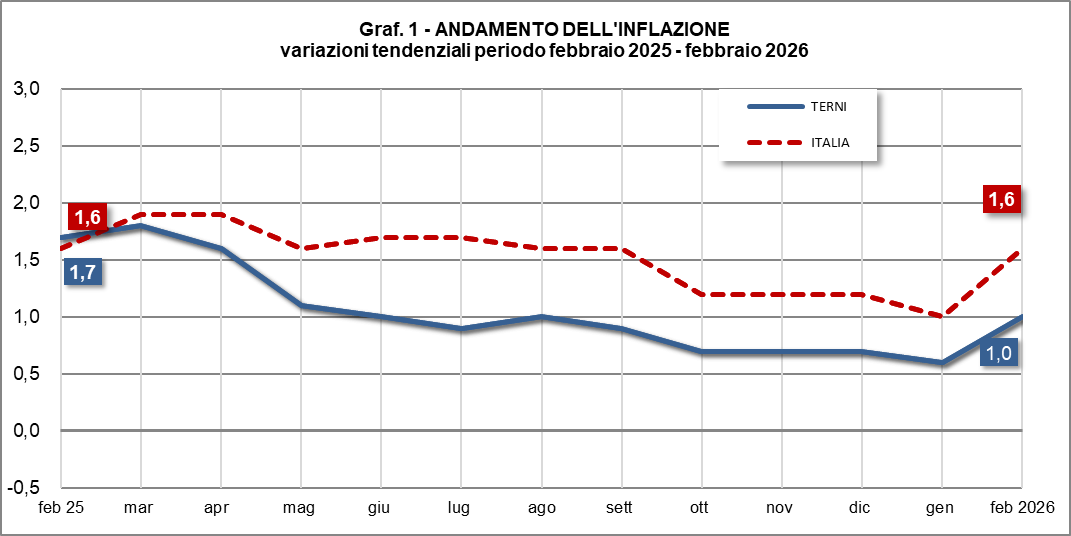 Anche a Terni a febbraio si assiste ad un rialzo che si attesta a 1% con un incremento rispetto a gennaio dello 0,6%. Su base annua l’andamento si è discostato dalla media nazionale infatti a febbraio 2025 il dato si attestava a 1,7% flettendo costantemente fino a gennaio 2026.