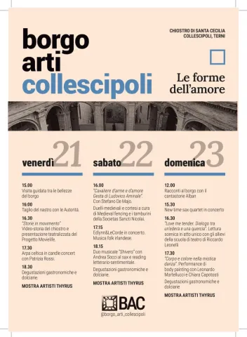 (ufficio stampa) - Dal 21 al 23 febbraio, il borgo di Collescipoli si trasforma in un palcoscenico dedicato all’arte, alla cultura e alle molteplici sfaccettature dell’amore. L’evento Borgo Arti Collescipoli: Le forme dell’amore propone un programma di incontri, spettacoli, concerti e mostre, per tre giornate all’insegna della bellezza e della creatività.