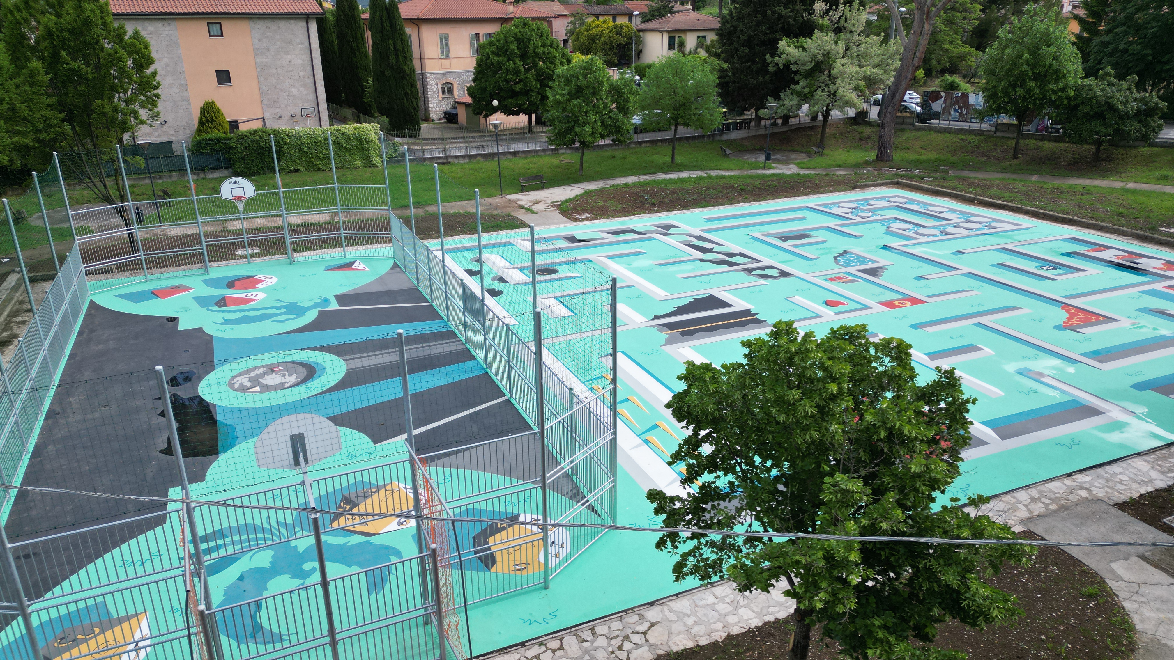 Un’arena multisport per calcetto e basket e il Labirinto Magico, una piastra di gioco tridimensionale realizzata in anamorfosi, completamente priva di barriere architettoniche e totalmente inclusiva, dove i piccoli utenti potranno dare sfogo alla libera fantasia nelle varie zone active presenti.