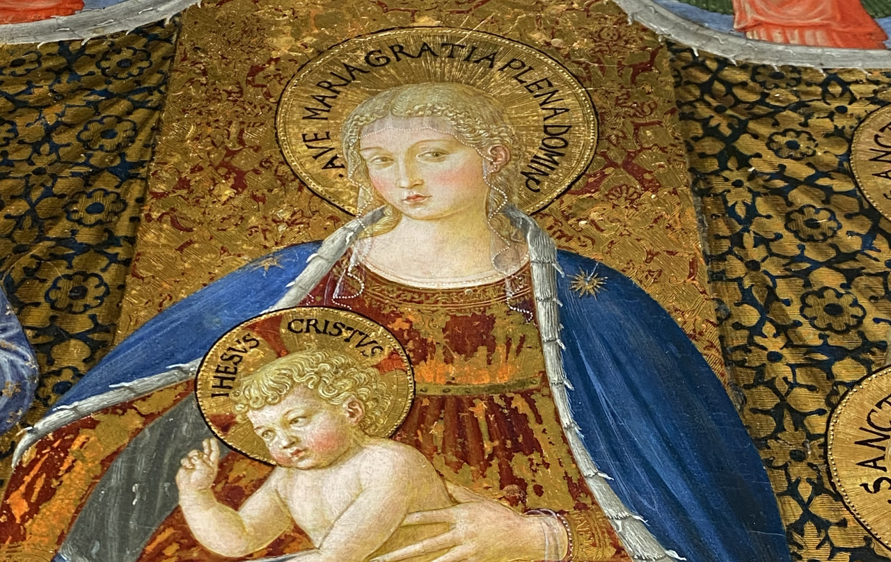 Lo sposalizio mistico di santa Caterina d’Alessandria e i santi Bartolomeo, Francesco e Lucia risale al 1466 ed è un’opera realizzata in tempera su tavola. Durante un soggiorno a San Gimignano, Benozzo Gozzoli la dipinse su commissione della famiglia Rustici di Terni per la cappella familiare nella chiesa di Santa Maria dell’Oro. Il dipinto, “prezioso come una miniatura” secondo Anna Padoa Rizzo, è lodato per la sua resa minuziosa dei dettagli e la ricchezza ornamentale, evidente nei broccati ricamati in oro e nelle pellicce di ermellino (https://museodefelice.comune.terni.it/)
