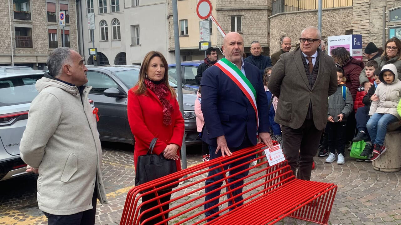 Una panchina rossa ricoperta dalla bandiera tricolore che è stata poi riposta dal sindaco Stefano Bandecchi, dal vicesindaco Riccardo Corridore e dagli assessori Marco Schenardi e Viviana Altamura, con loro alcuni consiglieri comunali.